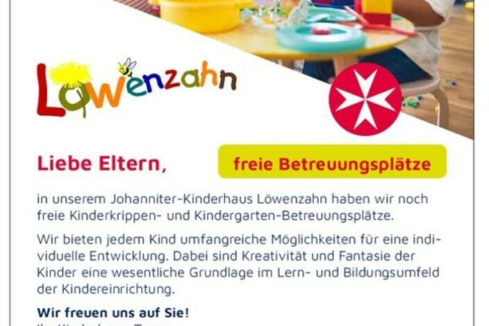 In der Kindertagesstätte Löwenzahn gibt es derzeit noch freie Plätze. Zwei Krippenplätze und drei Kindergartenplätze stehen zur Verfügung. Die Betreuung und Anmeldung sind sofort möglich.