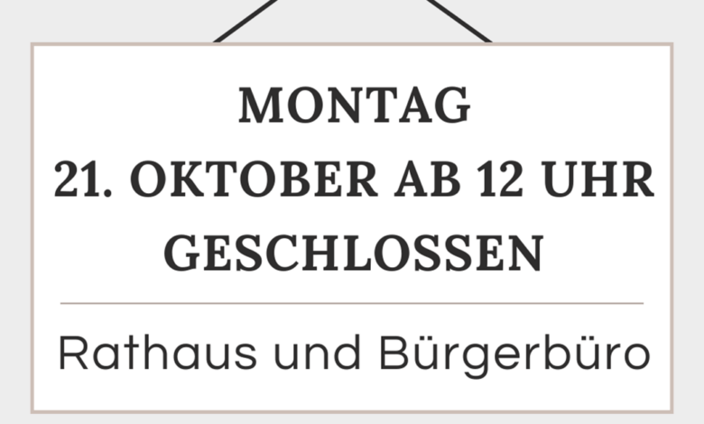 Am Montag, den 21. Oktober 2024, ist die Verwaltung im Rathaus Wörth nur von 8.00 bis 12.00 Uhr erreichbar. Nachmittags bleibt die Verwaltung geschlossen. Bürgerinnen und Bürger sollten sich darauf einstellen, dass sie am Nachmittag keine Dienstleistungen in Anspruch nehmen können.